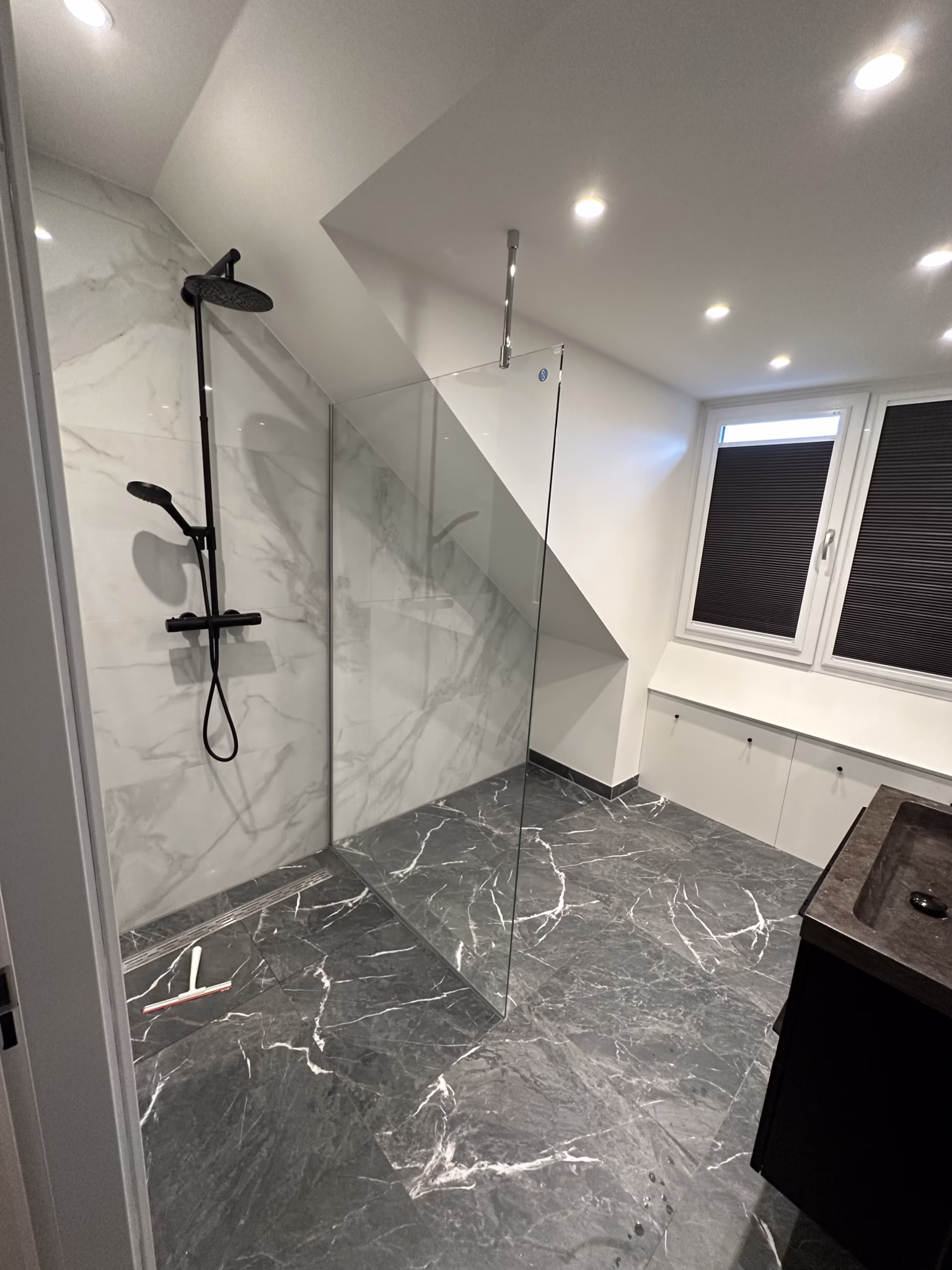 Voor onze klanten aan de Emanzana in Amsterdam hebben we een complete, luxe badkamer gerealiseerd met oog voor detail en hoogwaardige afwerking. De badkamer zelf is in augustus gebouwd, maar op verzoek van de klant hebben we het originele doucheglas niet direct geplaatst. Zij kozen namelijk bewust voor een minder opvallend glasproduct dat beter aansluit op de rustige, moderne uitstraling van de ruimte. Dit speciale glas is in november besteld en vervolgens volledig op maat gemonteerd.Het gekozen doucheglas is voorzien van een professionele polijst- en beschermlaag, waardoor het vuilafstotend is en eenvoudig schoon te houden blijft. Bovendien wordt het geleverd met 10 jaar garantie, wat zekerheid biedt op kwaliteit en duurzaamheid.De badkamer combineert grote marmerlook wand- en vloertegels met zwarte designkranen, een ingebouwde nis, een strakke wastafelopstelling en LED-spots in het plafond. Het schuine dak en de indeling maakten dit project een mooi staaltje maatwerk, waarbij het glas exact is afgesteld op de complexe lijnen van de ruimte.Het eindresultaat is een moderne, tijdloze badkamer met een hoogwaardige uitstraling waar de klant jarenlang plezier van heeft.